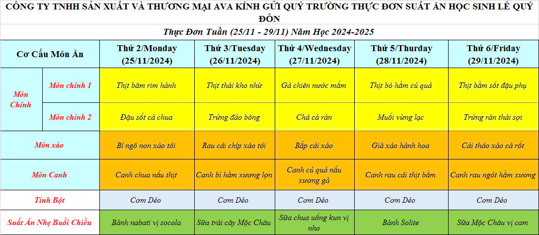 THỰC ĐƠN TUẦN 4 THÁNG 11 NĂM 2024